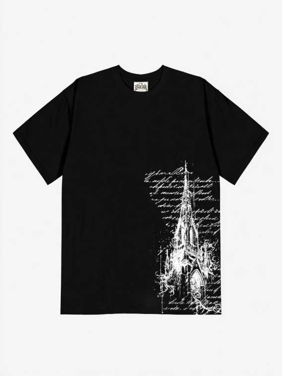 Resilience to czarna koszulka z eleganckim, białym nadrukiem w formie kaligraficznego napisu biegnącego wzdłuż prawej strony.