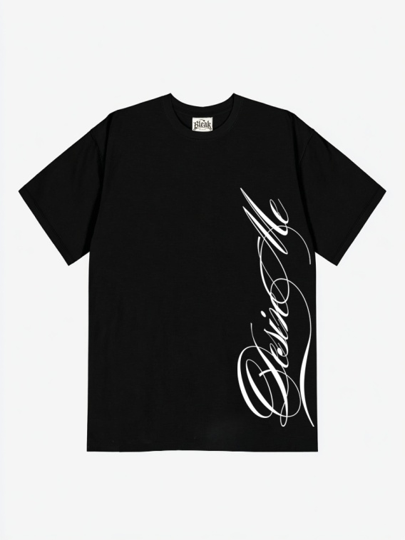 Desire Me to czarna koszulka z białym, kaligraficznym napisem umieszczonym pionowo wzdłuż prawej strony.