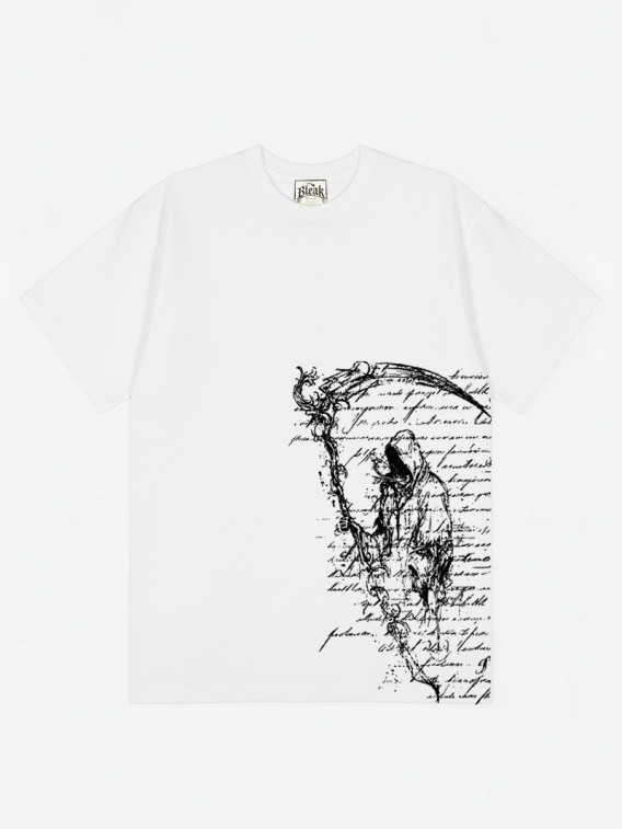 Cathedral to biała koszulka ozdobiona czarnym, misternym nadrukiem przedstawiającym gotycką, fantazyjną katedrę w stylu dark art.